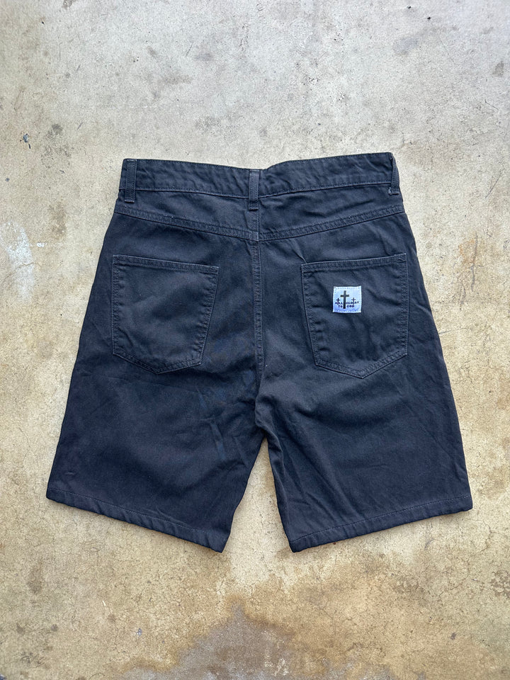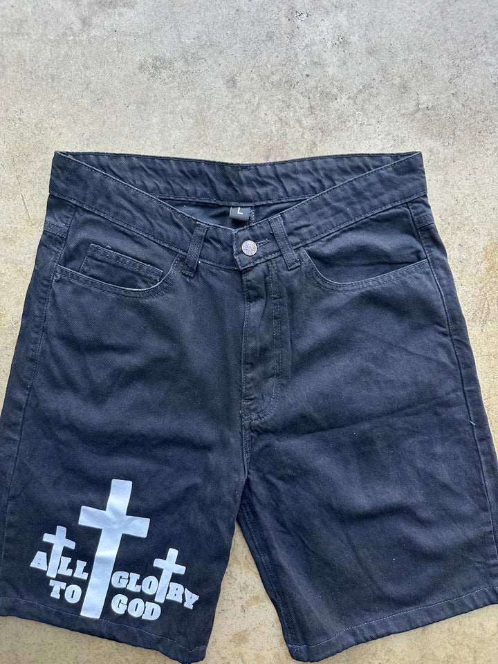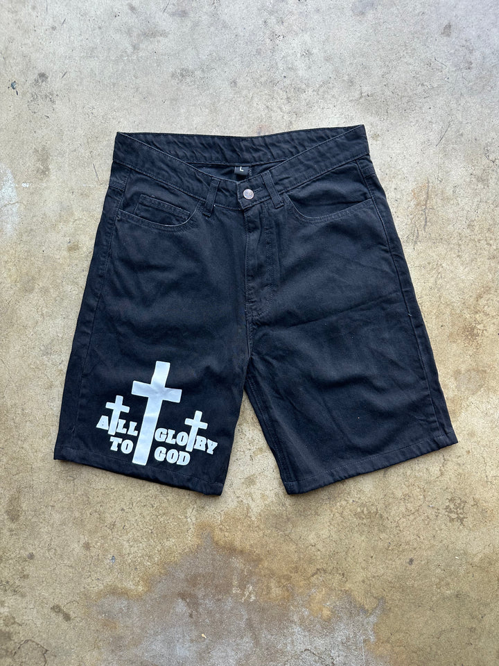 The ALL GLORY TO GOD JORTS BLUE feature high-quality denim with a relaxed, baggy fit that combines comfort and contemporary style. Their standout design invites attention and conversation, making them a unique addition to your wardrobe. Available now on sale, these jorts deliver both durability and effortless streetwear appeal.